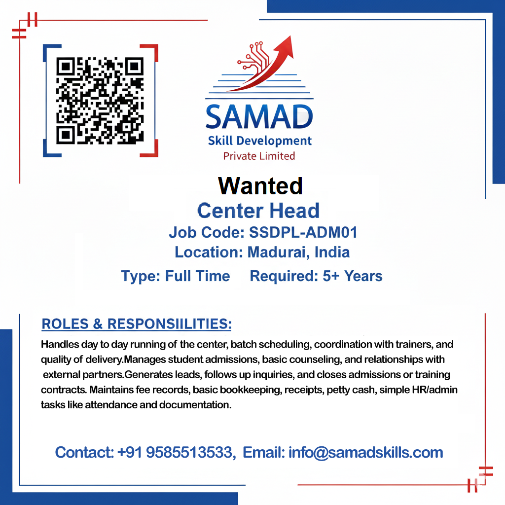 Handles day‑to‑day running of the center, batch scheduling, coordination with trainers, and quality of delivery.Manages student admissions, basic counseling, and relationships with external partners.Generates leads, follows up inquiries, and closes admissions or training contracts. Maintains fee records, basic bookkeeping, receipts, petty cash, simple HR/admin tasks like attendance and documentation.